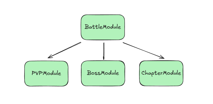 BattleModule은 인게임에서 전투 컨텐츠를 관리하고 전투 로직을 구성한다. BattleModule이라는 부모 클래스를 구성하고, 각각의 컨텐츠 Module은 이 BattleModule을 상속 받는 구조이다.