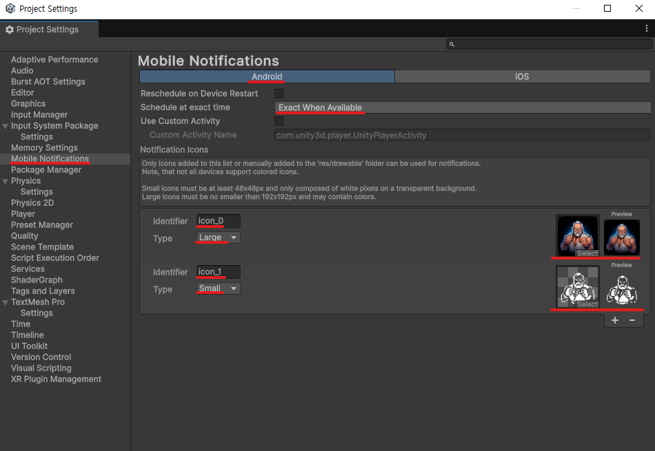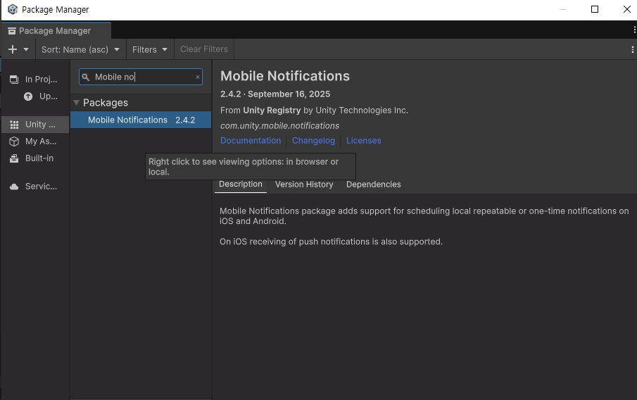 유니티에서 제공하는 로컬 알림을 띄우기 위한 공식 패키지. 앱이 꺼져있어도 지정한 시간에 기기로 알림을 보낼 수 있다. 안드로이드, IOS 모두 지원한다.
