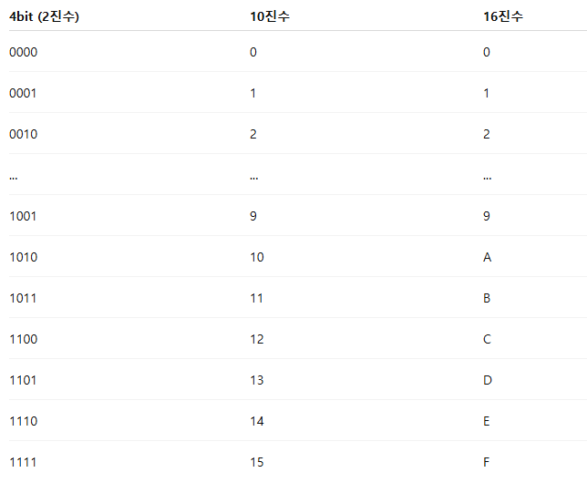 - 16진수는 4 bit 단위로 딱 떨어짐